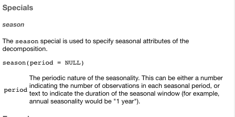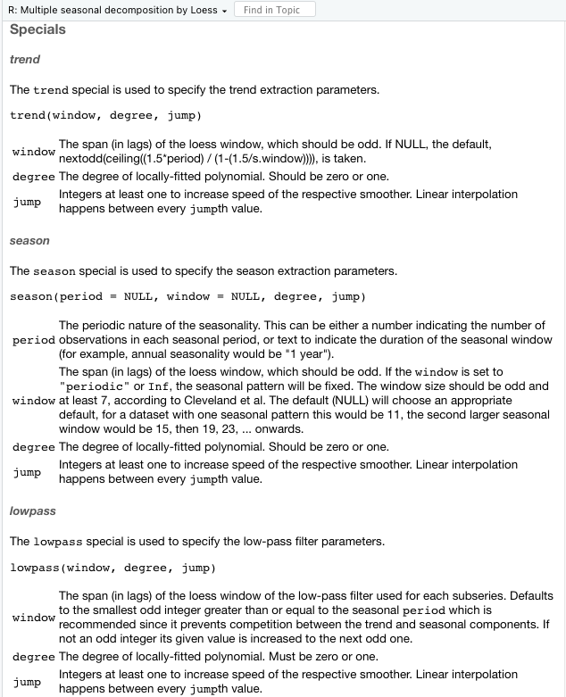 The key new element to the STL decomposition is the window argument. Over how many time periods should the trend/season be calculated. If one wishes to average over all periods, window="periodic" is the necessary syntax. For the STL decomposition, there are quite a few.