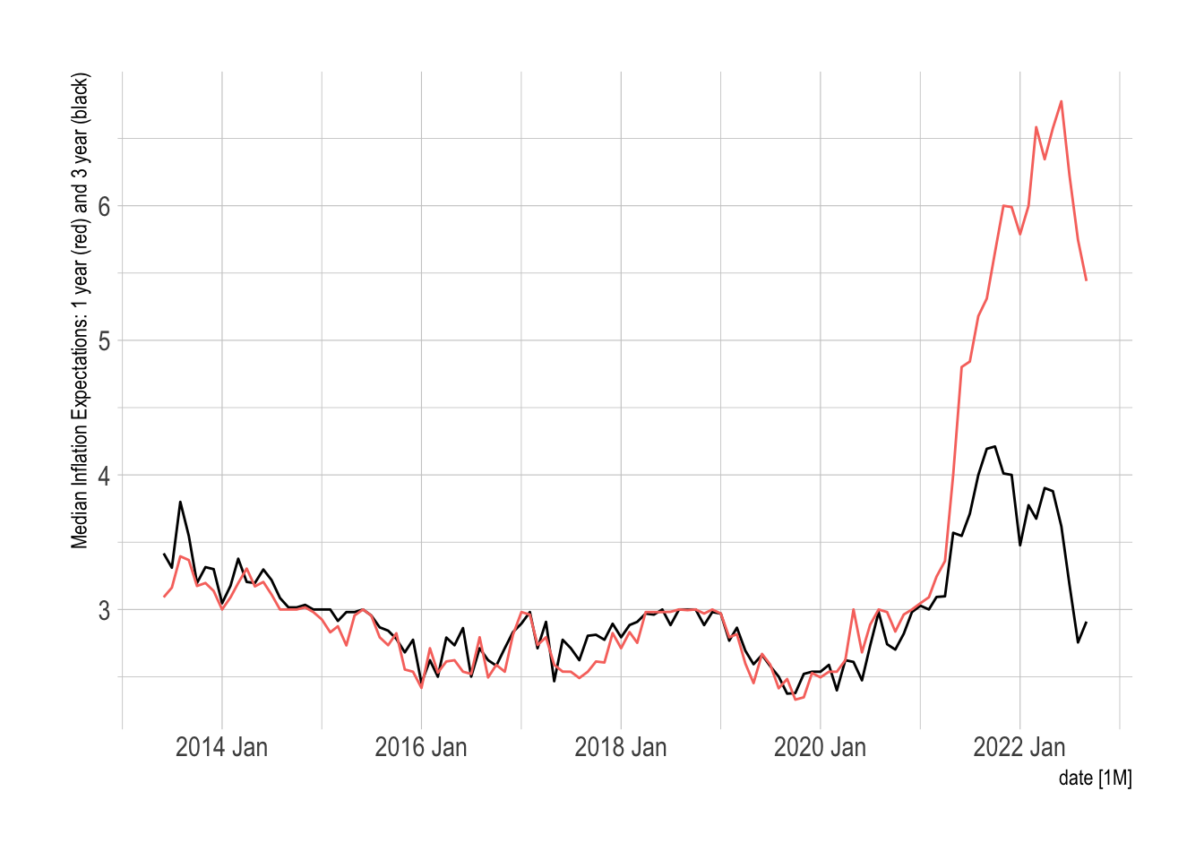 hrbrthemes::theme_ipsum() + guides(color = "none") + labs(y="Median Inflation Expectations: 1 year (red) and 3 year (black)")