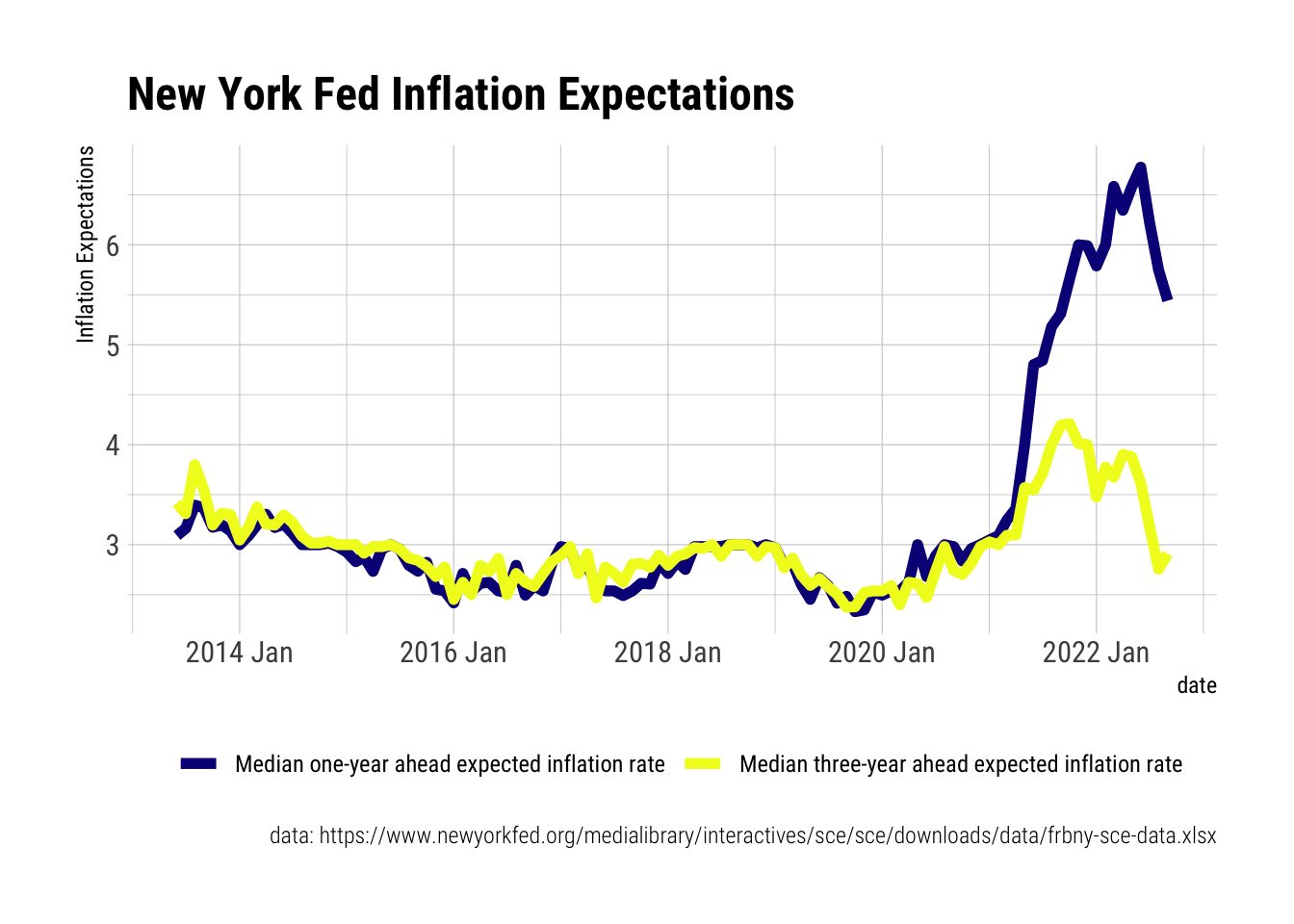 The Federal Reserve Bank of New York collects data on inflation expectations that are interesting to examine. As a part of the Survey of Consumer Expectations, these highlight consumers expected levels of inflation though the five-year expectations have only become a part of the series for 2022, more about this here that includes a bit of summary on the data. While consumers are probably not experts, it is important to note how expectations are anchored and also that question wording seems to matter, see de Bruin and van der Klaauw 2012.