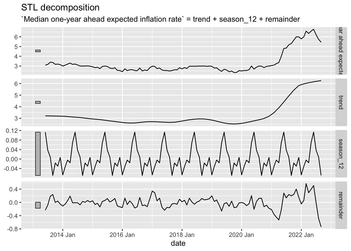 model(STL(`Median one-year ahead expected inflation rate` ~ season(12, window = "periodic"))) %>%
