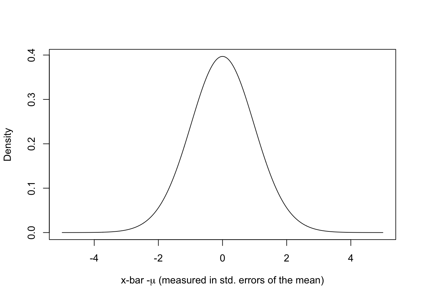 plot(seq(-5,5, by=0.01), dt(seq(-5,5, by=0.01), df=49), xlab=expression(paste("x-bar -",mu," (measured in std. errors of the mean)", sep="")), ylab="Density", type="l")