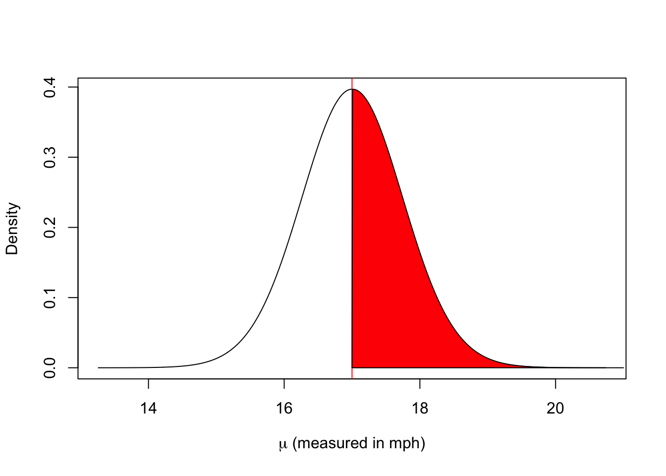 plot(x=17+seq(-5,5, by=0.01)*0.7478, dt(seq(-5,5, by=0.01), df=49), xlab=expression(paste(mu," (measured in mph)", sep="")), ylab="Density", type="l")