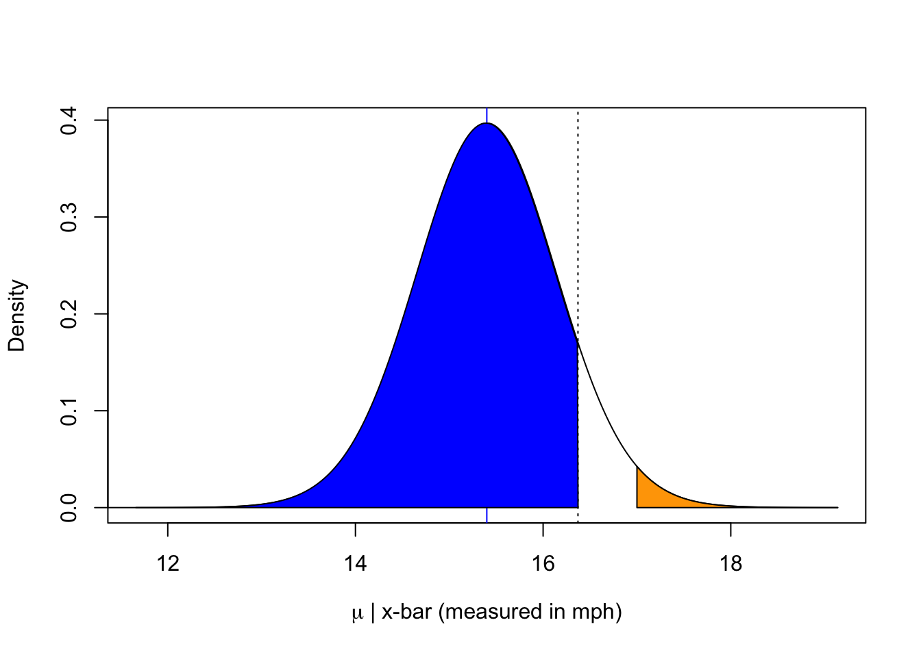 The probability of seeing such a small sample mean if the true average is 17 is only 0.01869. The probability above the dotted black line is 0.9 with 0.1 below. WIth 90% confidence, anything below this would be sufficient evidence to reject the claim that the true average is 17 or above.