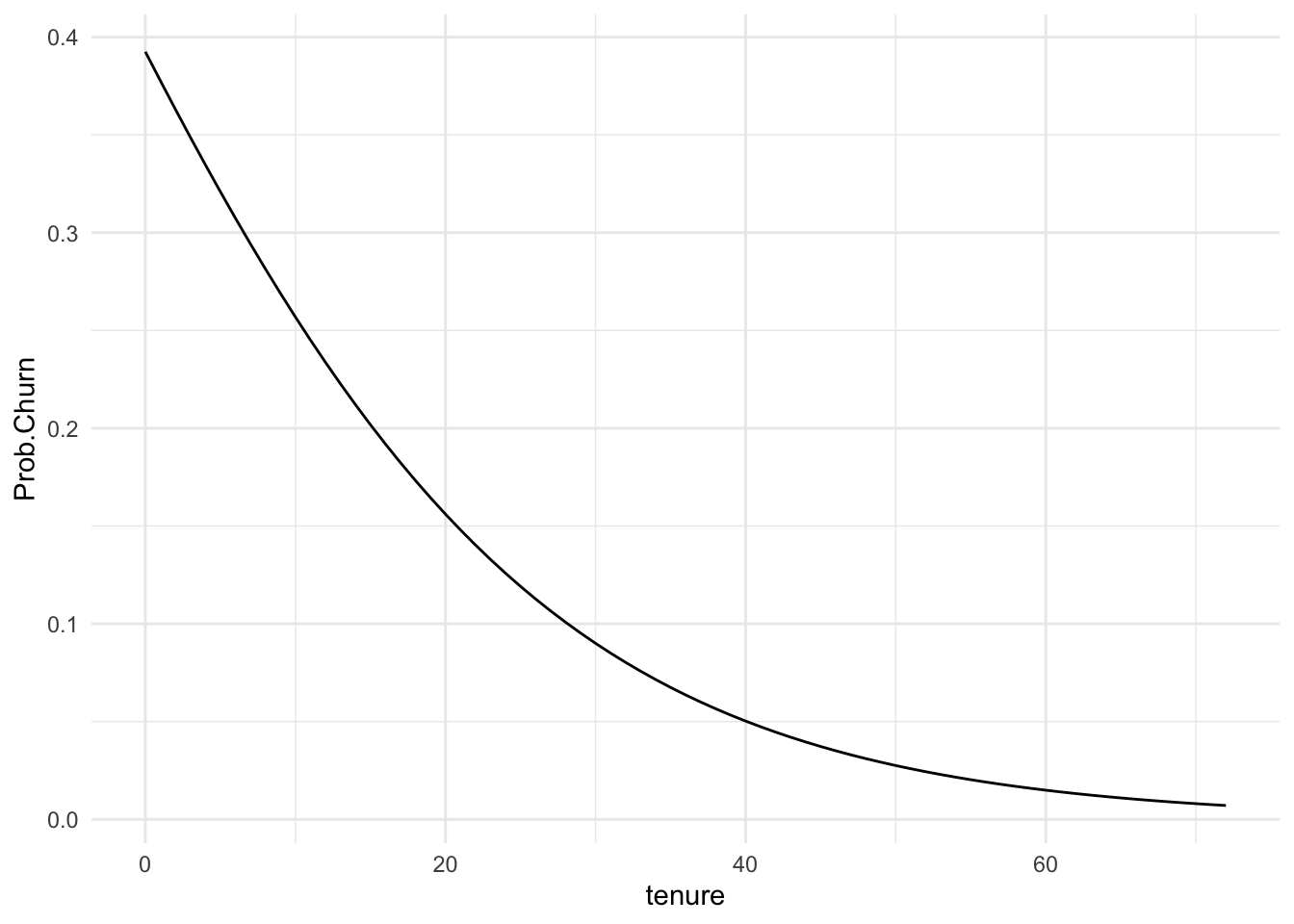 ```{r}ggplot(Tenure.Pred) +aes(x = tenure, y = Prob.Churn) +geom_line() +theme_minimal()```