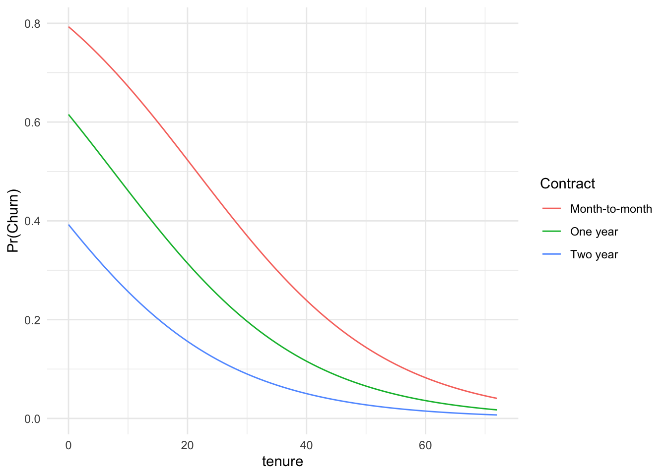 ```{r}Tenure.Pred.Three <-rbind(data.frame(InternetService ="DSL", PhoneService ="Yes",Contract ="Month-to-month", TotalCharges =4733.5, tenure =seq(0, 72, by =1)),data.frame(InternetService ="DSL", PhoneService ="Yes", Contract ="One year",TotalCharges =4733.5, tenure =seq(0, 72, by =1)), data.frame(InternetService ="DSL",PhoneService ="Yes", Contract ="Two year", TotalCharges =4733.5, tenure =seq(0,72, by =1)))Tenure.Pred.Three$Prob.Churn <-predict(my.logit, newdata = Tenure.Pred.Three, type ="response")ggplot(Tenure.Pred.Three) +aes(x = tenure, y = Prob.Churn, color = Contract) +geom_line() +theme_minimal() +labs(y ="Pr(Churn)")```