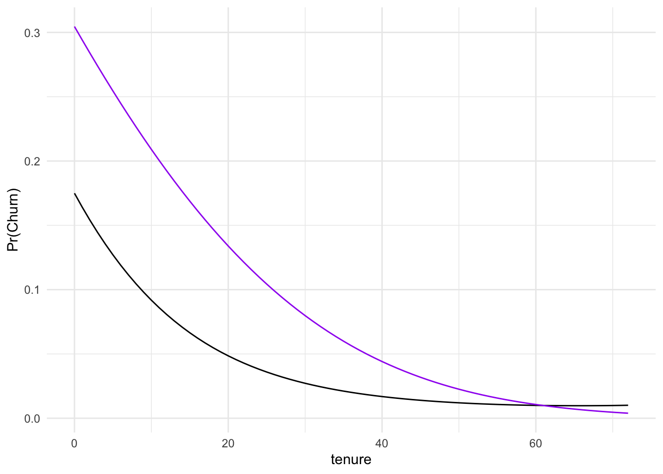 ```{r}Tenure.Pred$Prob.Churn.2<-predict(mod.train, newdata = Tenure.Pred, type ="response")Tenure.Pred$Prob.Churn.Sq <-predict(mod.train.SQ, newdata = Tenure.Pred, type ="response")ggplot(Tenure.Pred) +aes(x = tenure, y = Prob.Churn.Sq) +geom_line() +geom_line(aes(y = Prob.Churn.2),color ="purple") +theme_minimal() +labs(y ="Pr(Churn)")```