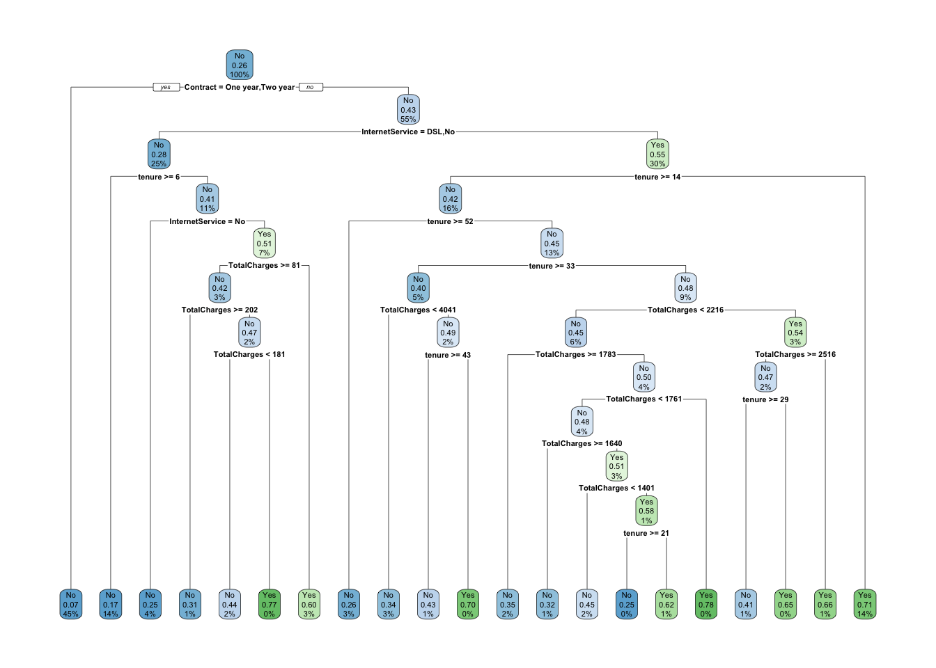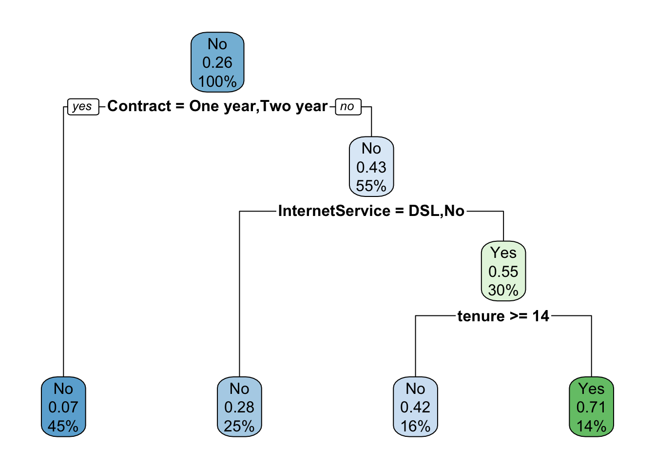 Now you might say that the fact we can only get 50 to 55 percent of Churn='Yes' with the model, remember that only 26.5 percent of people Churn overall so we have improved quite a bit over knowing nothing at all but the raw row probability. In this specific case, the probability of Yes in the test set is shown below.