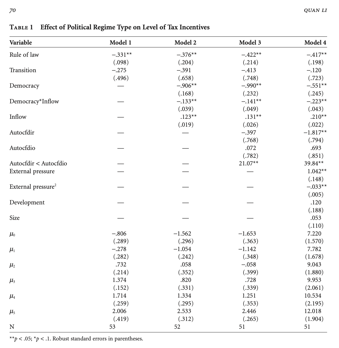 li.mod4 <- polr(generositygF ~ law00log + transition + fdiinf + democfdi + democ + autocfdi2 + autocfdir + reggengl + reggengl2 + gdppclog + gdplog, data=Li.Data)