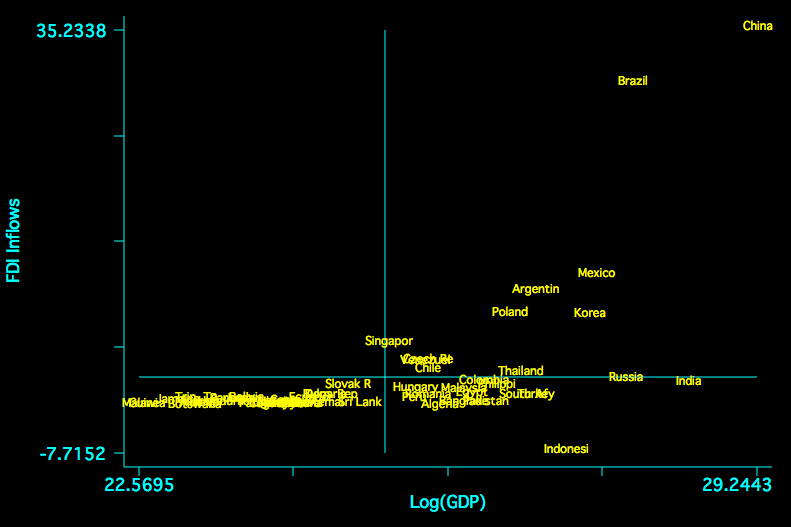 There is also a concern about FDI and economies of scale. The following is a plot of the relationship between FDI and size of the economy in the sample.